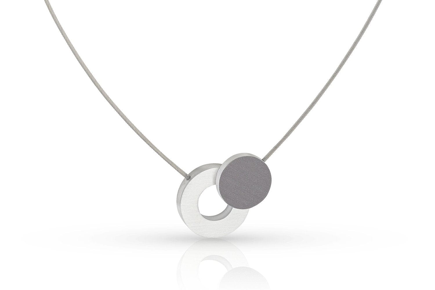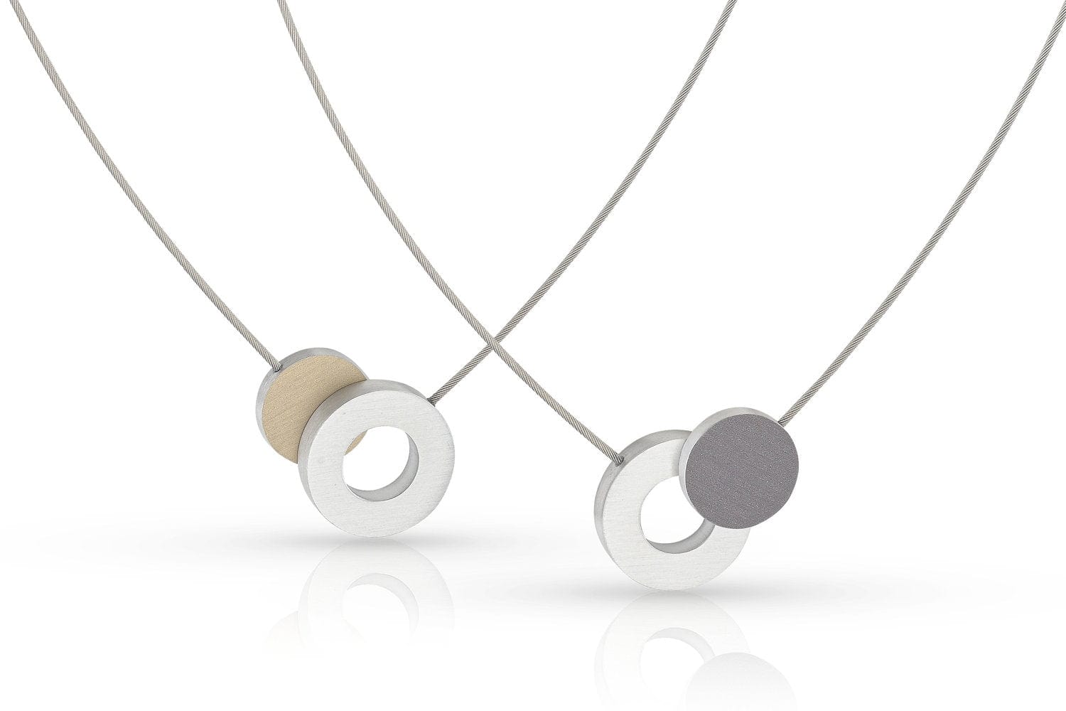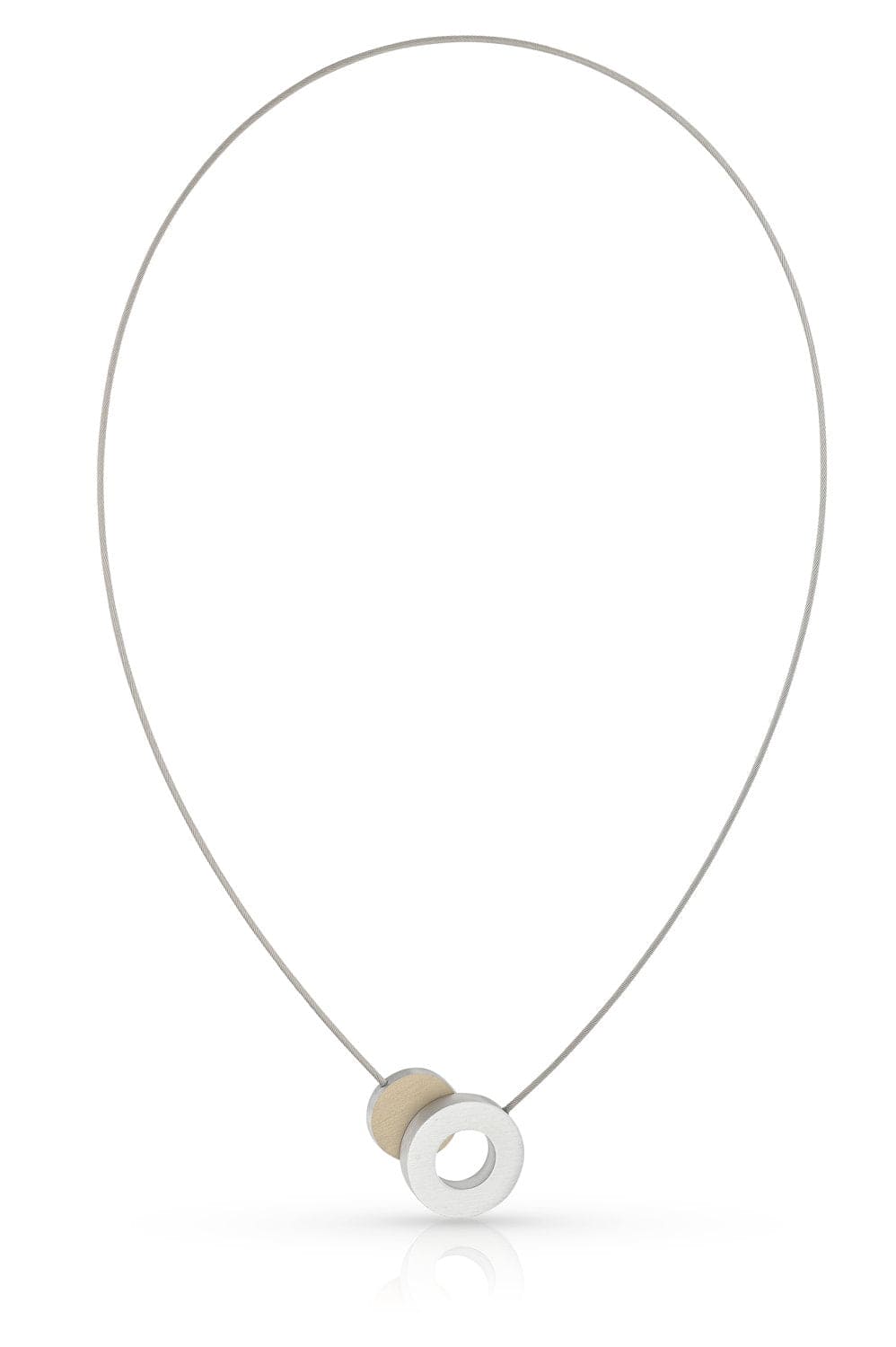 Collier van een ring met een rondje in pastel als magnetische sluiting. De ketting opent door het ronde deel van de ring te halen. De magneten trekken elkaar aan en met een "clic" sluit dit collier. Deze ketting is uitgevoerd in een mat deel en een gekleurd deel.