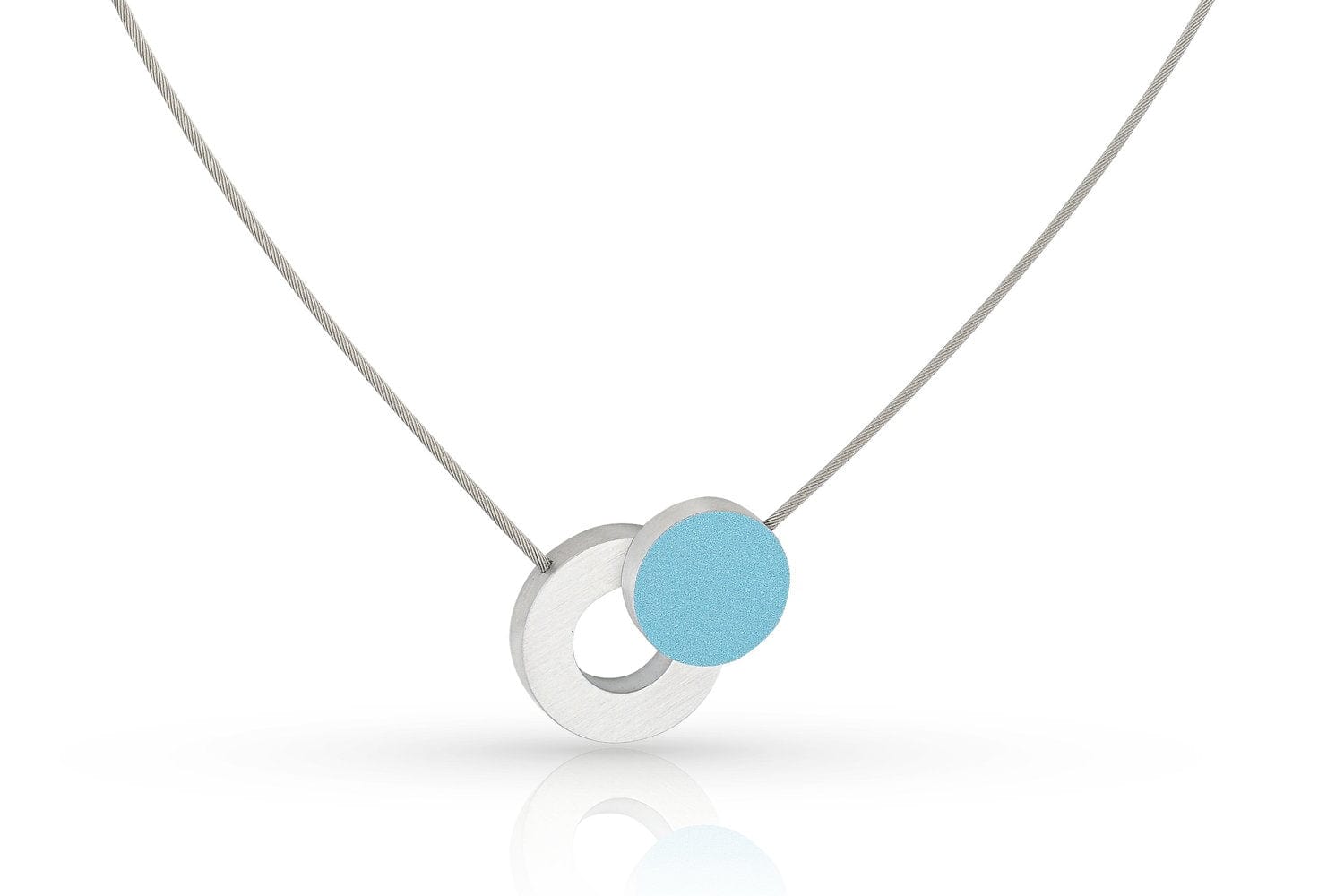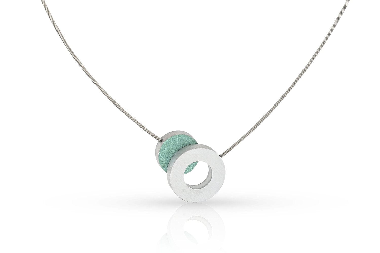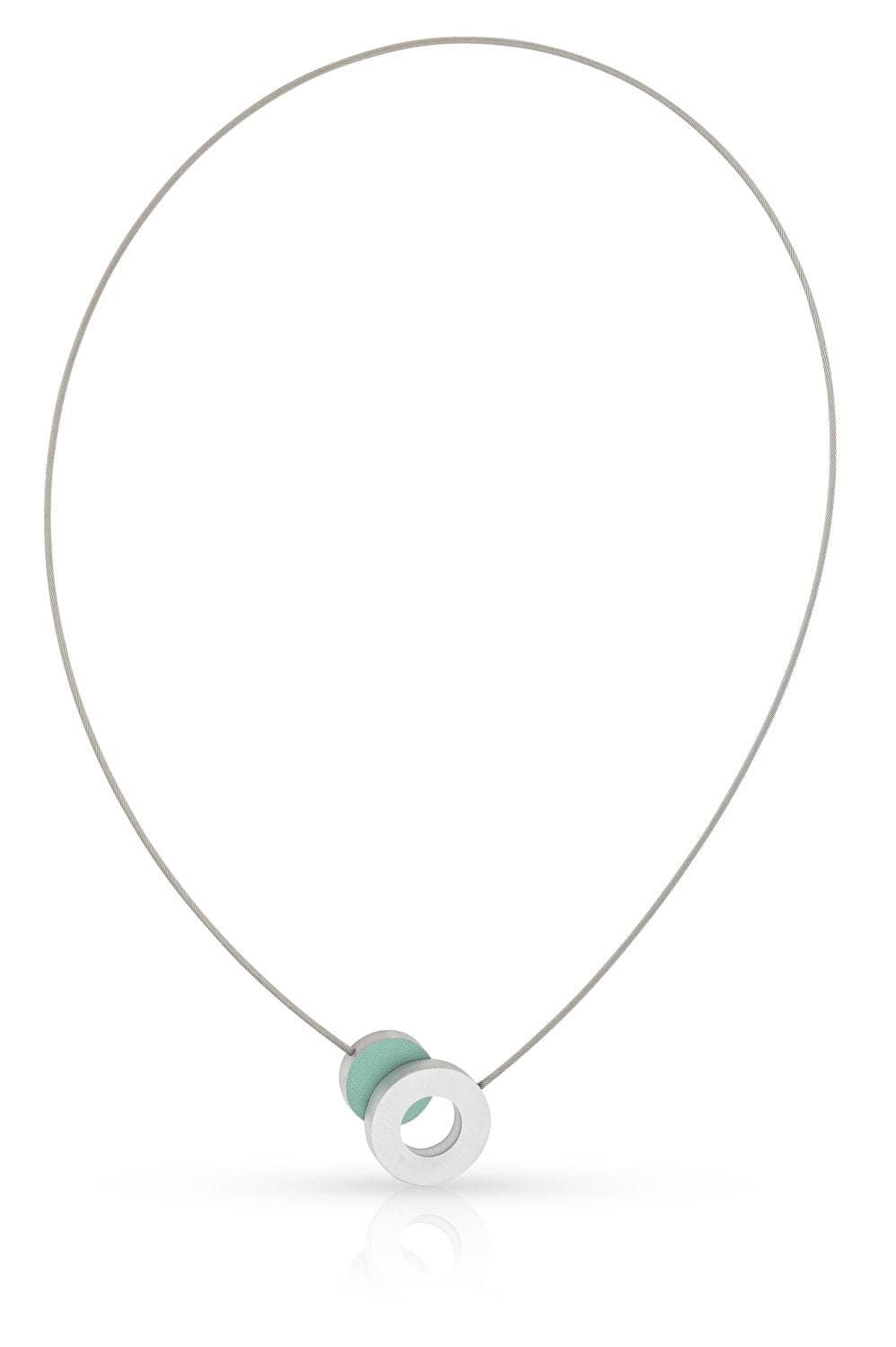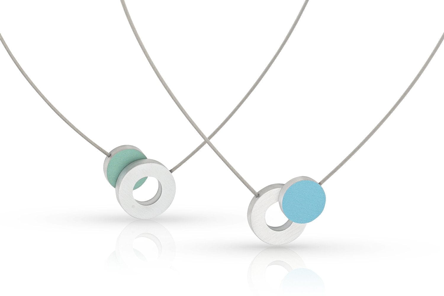 Collier van een ring met een rondje in pastel als magnetische sluiting. De ketting opent door het ronde deel van de ring te halen. De magneten trekken elkaar aan en met een "clic" sluit dit collier. Deze ketting is uitgevoerd in een mat deel en een gekleurd deel.