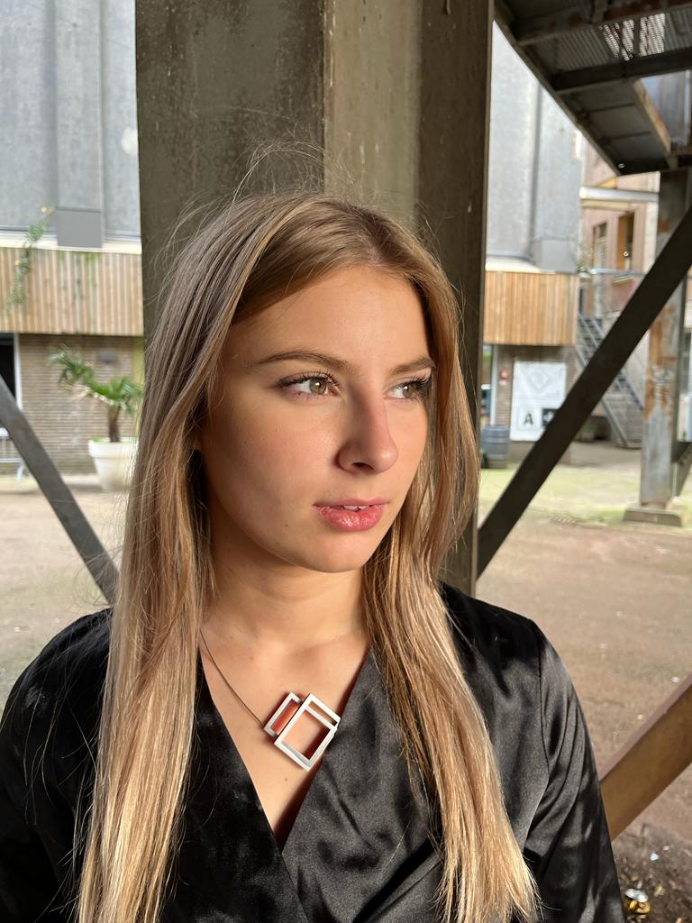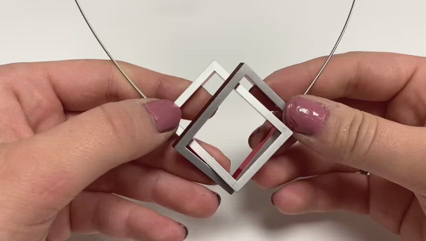 Een collier van twee open rechthoeken diagonaal gesloten samen met een magnetische sluiting er tussen verborgen. De magneten trekken elkaar aan en met een "clic" sluit dit collier. Deze ketting is uitgevoerd in mat met de zijkanten in een kleur geanodiseerd. Dit collier kun je combineren met andere items uit onze collectie zoals de kleine, kubusjes O28 en de ring R4.