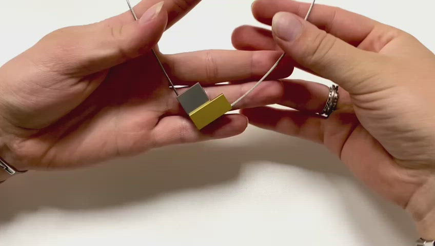 Collier in V-vorm met een aluminium rechthoek en een gekleurde rechthoek erop en een magneetsluiting daartussen. Deze ketting is verkrijgbaar in verschillende kleuren. De magnetische sluiting zit tussen de rechthoekjes verborgen in het ornament en heeft een soepel dragende edelstalen collier draad. Dit eenvoudige basis collier kun je altijd combineren met andere items uit onze collectie zoals de kleine kubus oorknopjes O28 en de ring R4. Tijdloos en basic in de vormgeving.