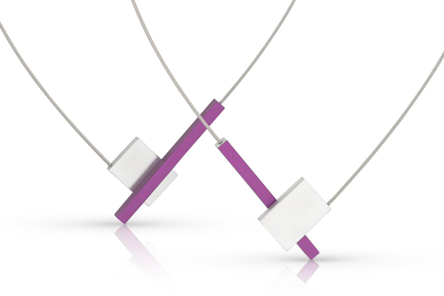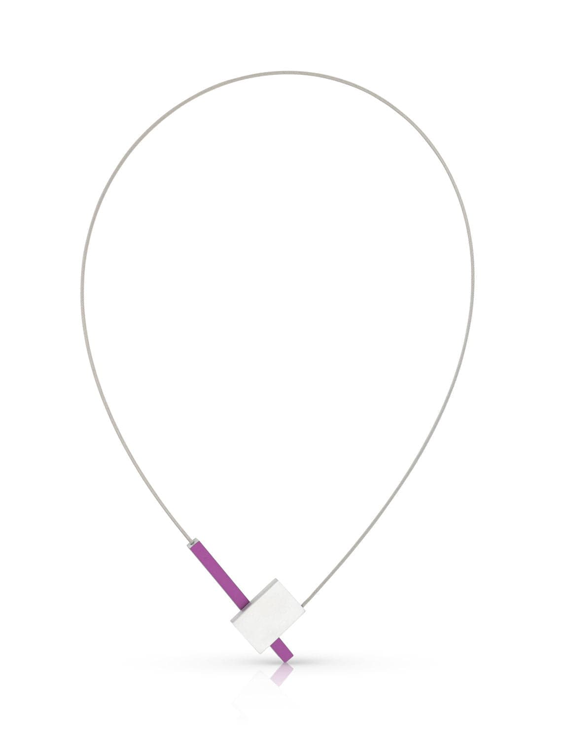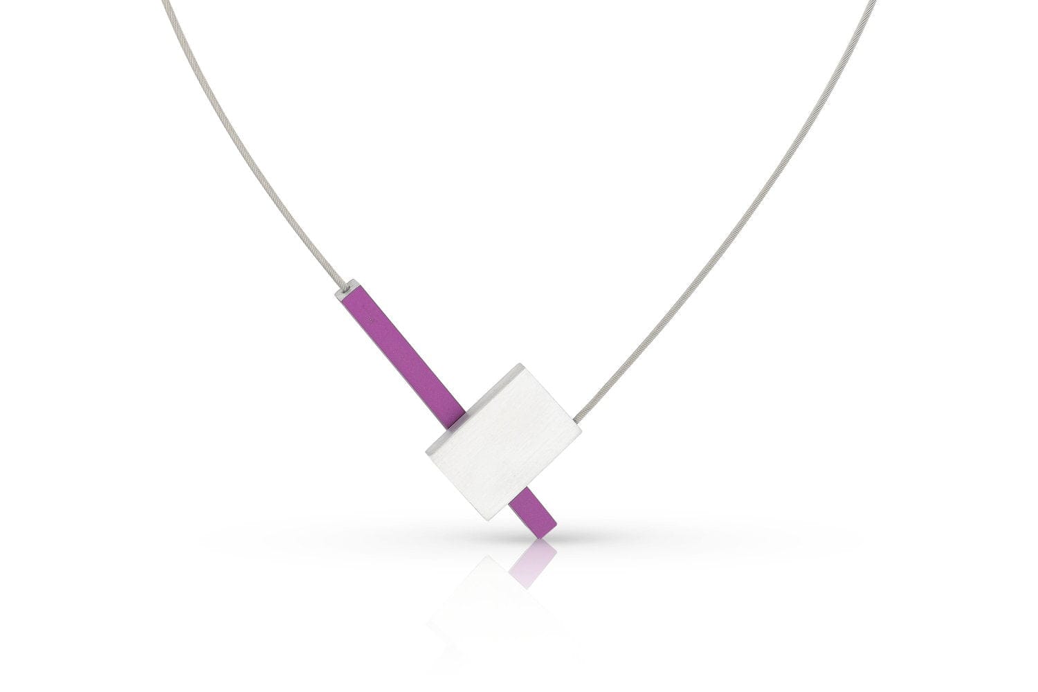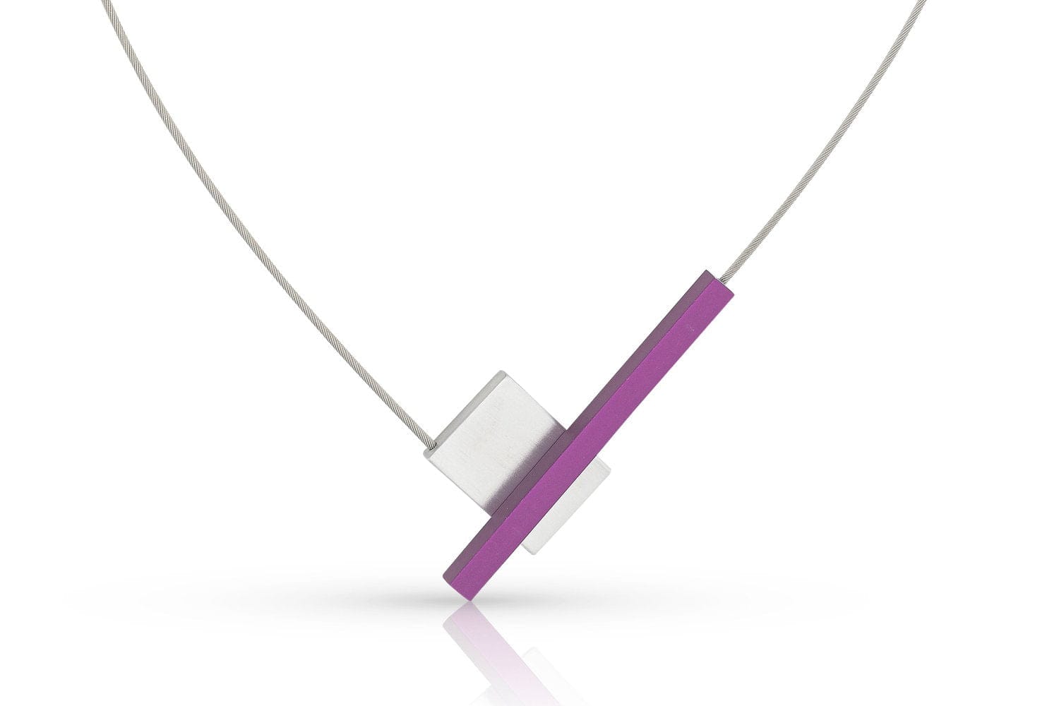 Collier in V-vorm met een aluminium rechthoek, staafje erop en een magneetsluiting daartussen. Deze ketting is verkrijgbaar in verschillende kleuren. De magnetische sluiting zit tussen het staafje en het rechthoekje verborgen in het ornament en heeft een soepel dragende edelstalen collier draad. Dit eenvoudige basis collier kun je altijd combineren met andere items uit onze collectie zoals de kleine kubus oorknopjes O28 en de ring R4. Tijdloos en basic in de vormgeving.